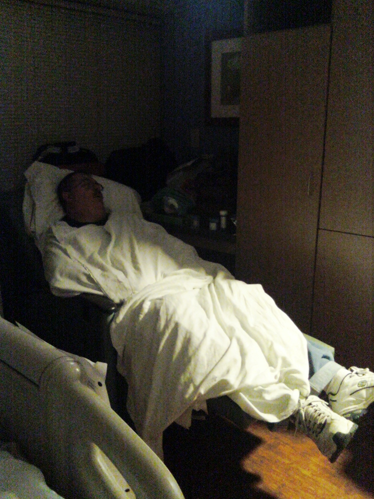At 1 a.m., no chair. At 2 a.m. At 3 a.m., the nurse came in for check vitals, saw that Doug was sitting straight up in a chair, sound asleep, and decided he needed a recliner. In about 10 minutes, he was ensconced in this little beauty.
