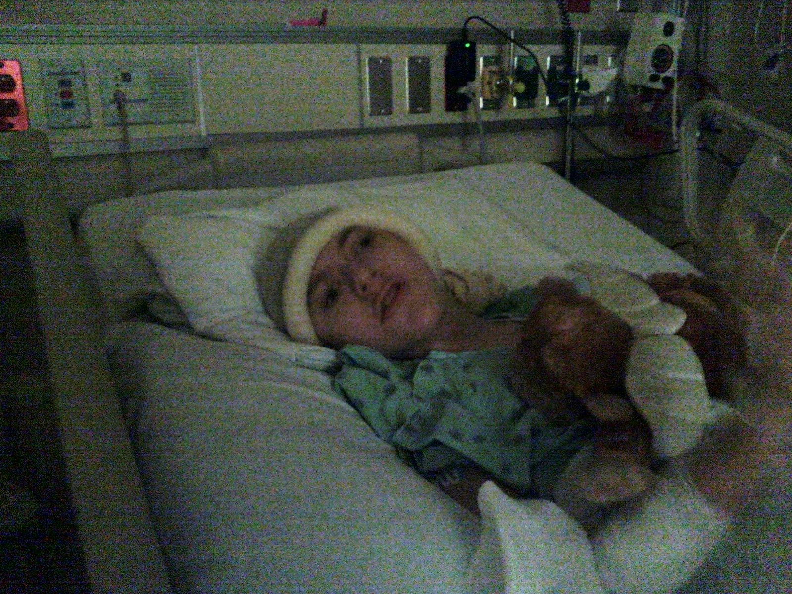 I know this pic is very grainy, but it was too cute to leave out. Isaac woke up at 4 a.m. as bright as a new penny. Here he is grinning with that little smirk, and seemed to be feeling so much better.
